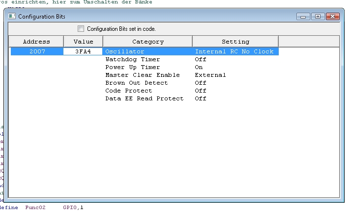 Die Einstellungen des PIC (die configuration Bits) sind in diesem Beispiel NICHT im Programm festgelegt, das muss in MPLAB mit „Configure -> Configuration Bits“ manuell festgelegt werden.