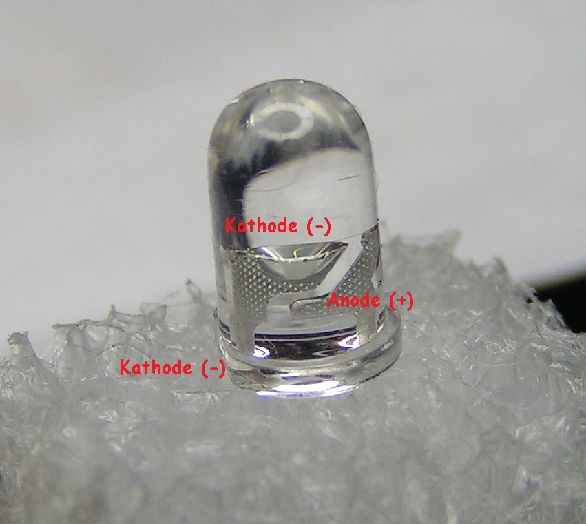 Meist ist die Kathode mit dem kürzeren Anschlussbein versehen oder hat eine leichte Abflachung am Gehäuse.